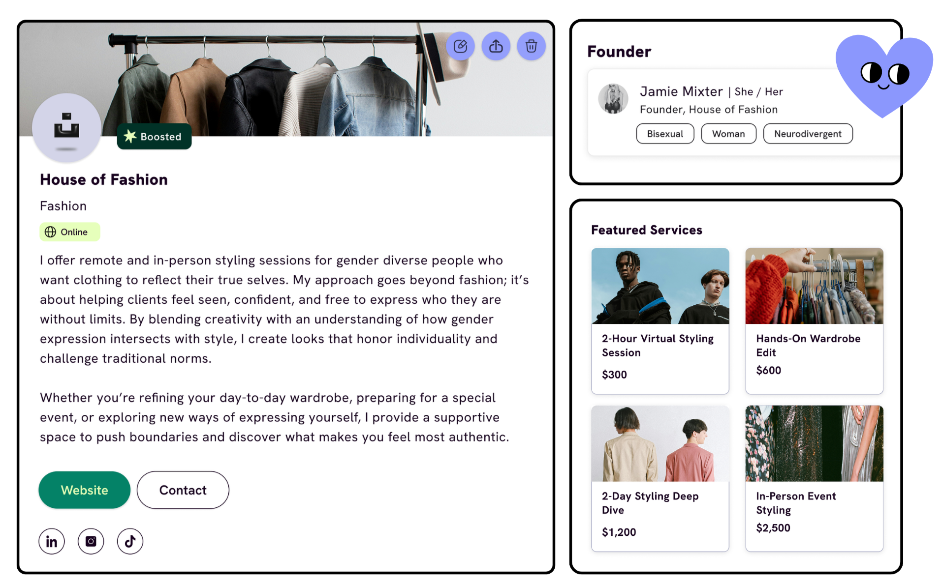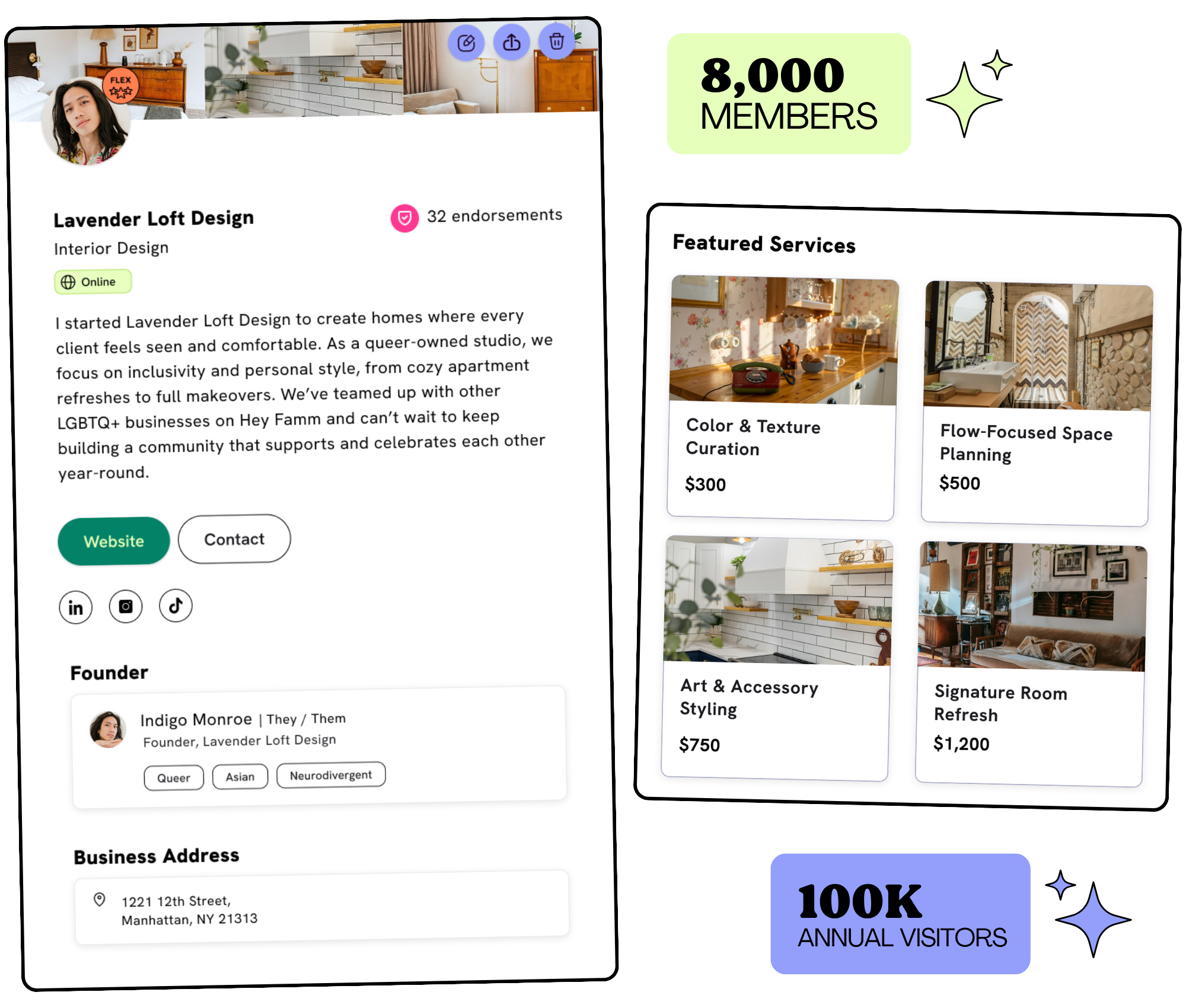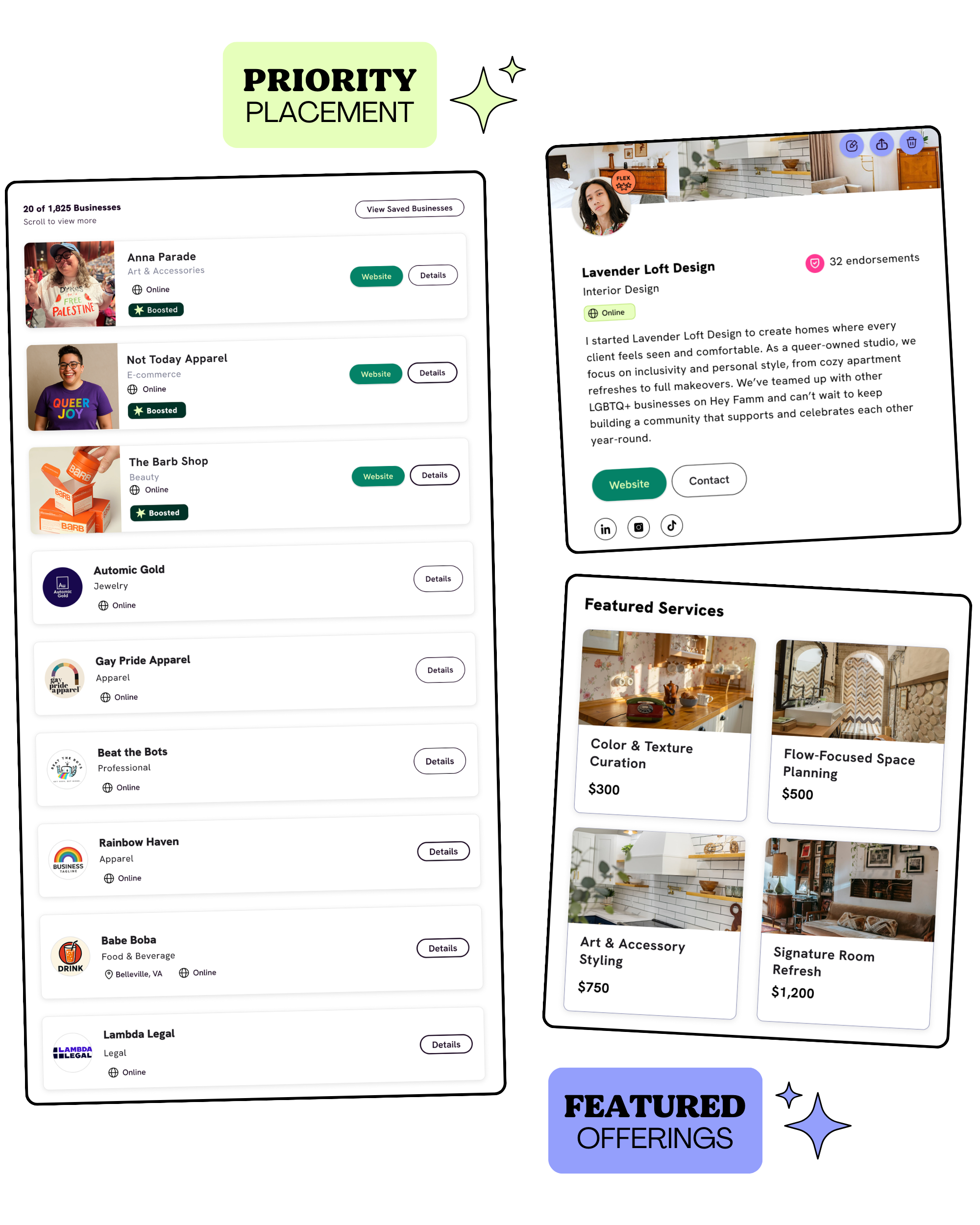 A Boosted Business Page puts your business in front of 8,000+ LGBTQ+ community members. Plus, 100K annual visitors who discover Hey Famm each year.